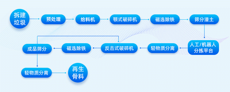 該生產(chǎn)線原料為建筑垃圾(拆遷垃圾、裝修垃圾、混凝土塊);產(chǎn)能為100噸/時(shí);成品料主要用于再生骨料、再生砂、再生磚原料......