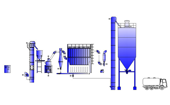 4、集粉階段:符合細(xì)度的粉子隨氣流經(jīng)管道進(jìn)入集粉系統(tǒng),氣粉分離,成品粉由輸送裝置送至成品料倉,再統(tǒng)一用裝粉罐車或者自動打包機(jī)進(jìn)行包裝。