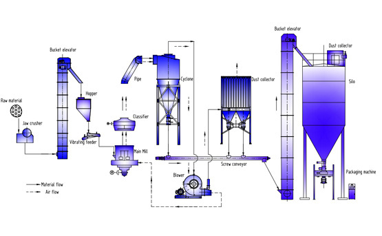 2、磨粉階段:滿足入磨條件的小塊物料經(jīng)輸送給料系統(tǒng)均勻定量的進入磨機研磨室,在磨腔內(nèi)研磨成粉。