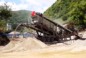 可以通過(guò)挖機(jī)或者鏟車上料到移動(dòng)站的大料倉(cāng),料倉(cāng)下給料機(jī)均勻給料到C6X顎破機(jī)內(nèi)破碎,顎破出來(lái)的料先上振動(dòng)篩篩分篩分出部分成品,其余大料進(jìn)入HST單缸液壓圓錐破破碎之后,共用顎破出料的主皮帶機(jī)送料到振動(dòng)篩篩分,篩分出三種規(guī)格的成品料,篩網(wǎng)可根據(jù)客戶具體需要定制。