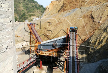 開山爆破的石灰石,經(jīng)過F5X1360給料機(jī)預(yù)篩分,50mm以下小料及渣土進(jìn)入除土篩,小料直接輸送到鄂破的出料皮帶上,大料經(jīng)過顎破破碎后和小料一起進(jìn)入中轉(zhuǎn)料倉(cāng),而后由皮帶輸送機(jī)進(jìn)入一臺(tái)CI5X1520新型液壓反擊破破碎,出來的石料經(jīng)過兩臺(tái)S5X2460-2新型振動(dòng)篩篩分,大料返到一臺(tái)PF1315反擊破破碎,20-31.5mm成品碎石篩出,其余0-20mm碎石進(jìn)入兩臺(tái)S5X2460-3進(jìn)行篩分,篩分出0-5-10-20三種成品。