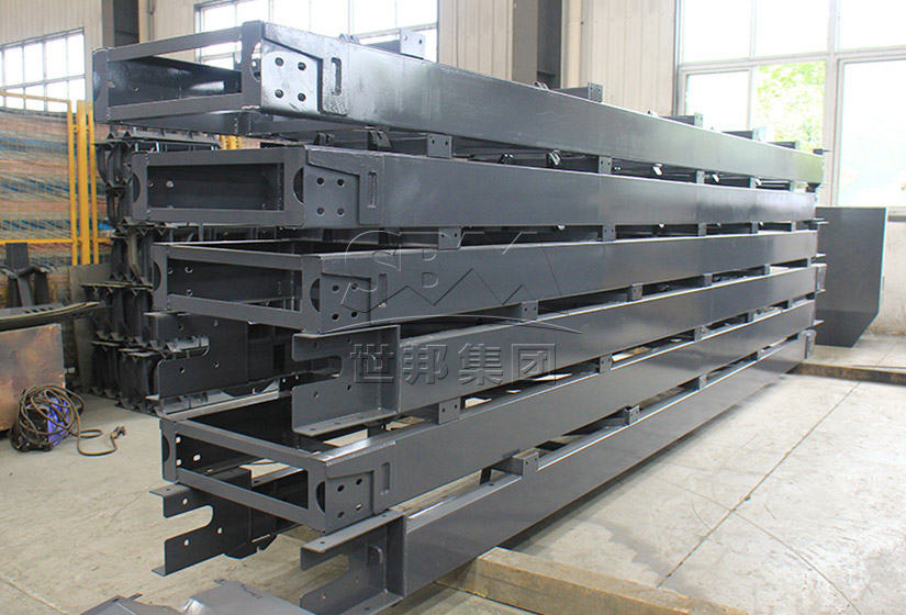 傳統(tǒng)皮帶機一般使用槽鋼和托輥架搭配使用,機架相對單薄。而B6X皮帶機在這一點上做了變革——使用C型鋼代替了槽鋼并配備側(cè)護板,基于這個改進,B6X系列皮帶機機架總體鋼性得以大大提升。