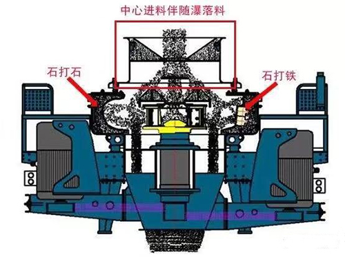 VSI制砂機(jī)除了有兩種進(jìn)料方式:完全中心進(jìn)料和中心進(jìn)料伴隨瀑落進(jìn)料,還有兩種破碎方式:“石打石”和“石打鐵”。“石打石”適用于整形,“石打鐵”適用于制砂。