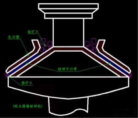 短頭型的平行帶較長(zhǎng),給礦口和排礦口均比較小,可以獲得較細(xì)產(chǎn)品粒度。一般均將平行帶較長(zhǎng)的短頭型作為細(xì)碎放在中碎之后。而標(biāo)準(zhǔn)型由于平行帶較短,故破碎產(chǎn)品較粗,產(chǎn)量較高,一般放在粗破碎之后,即顎破或旋回破碎機(jī)之后作為中碎用。一言以概之,標(biāo)準(zhǔn)型、中型、短頭型的給礦口逐漸減小,而破碎腔和平行區(qū)漸長(zhǎng)。