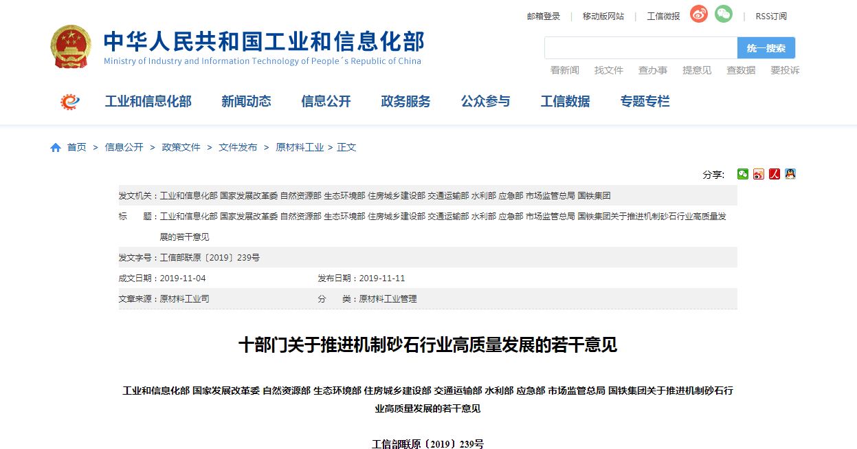 2019年11月11日,工業(yè)和信息化部、國家發(fā)展改革委、自然資源部、生態(tài)環(huán)境部、住房城鄉(xiāng)建設(shè)部、交通運輸部、水利部、應(yīng)急部 、市場監(jiān)管總局和國鐵集團等國家十部門發(fā)布《關(guān)于推進機制砂石行業(yè)高質(zhì)量發(fā)展的若干意見》。在此之前,已有多省出臺政策,通過建立機制砂生產(chǎn)基地、發(fā)布機制砂應(yīng)用標準等措施,促進機制砂推廣應(yīng)用。