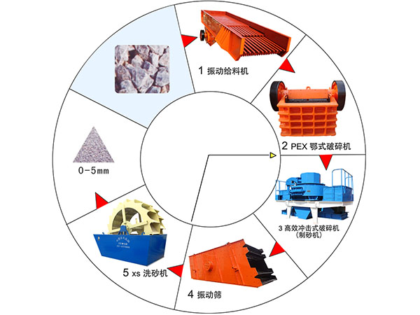 礦石由振動(dòng)給料機(jī)均勻地送到顎式破碎機(jī)進(jìn)行粗破,粗破后的物料由膠帶輸送機(jī)送入到制砂機(jī)進(jìn)行進(jìn)一步破碎,細(xì)碎后的物料被輸送到振動(dòng)篩進(jìn)行篩分,達(dá)到成品粒度要求的物料被送入洗砂機(jī)清洗,清洗后由成品輸送帶輸出即為成品;未達(dá)到成品粒度要求的物料從振動(dòng)篩返回制砂機(jī)重新加工,形成閉路多次循環(huán)。成品粒度可按用戶的需求進(jìn)行組合和分級(jí)。