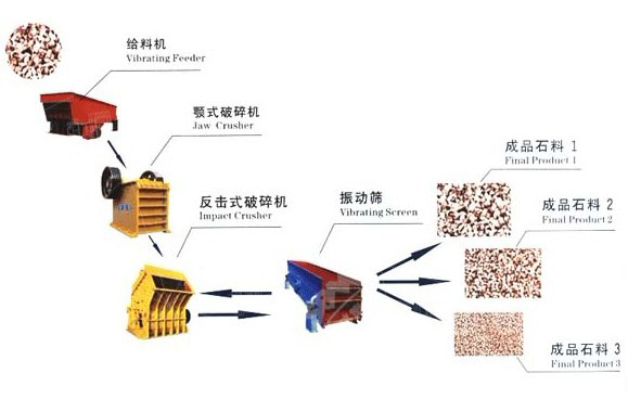 大塊石料經(jīng)料倉由振動(dòng)給料機(jī)均勻的送進(jìn)顎式破碎機(jī)進(jìn)行粗碎,粗碎后的石料由輸送機(jī)送到反擊式破碎機(jī)進(jìn)行進(jìn)一步破碎,細(xì)碎后的石料由輸送機(jī)送到振動(dòng)篩進(jìn)行篩分,篩分出幾種不同規(guī)格的石子,滿足顆粒要求的石子,由成品輸送機(jī)送往成品料堆,不滿足顆粒要求的石子,由輸送機(jī)返料送到反擊式破碎機(jī)進(jìn)行再次破碎,形成閉路多次循環(huán),成品粒度可按照用戶的需求,進(jìn)行組合和分級,為保護(hù)環(huán)境,可配置輔助的除塵設(shè)備。