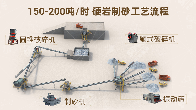 機制砂生產線系統(tǒng)由粗碎(顎式破碎機)——預篩分(振動篩)——中碎(反擊破碎機或圓錐破碎機)——制砂(高效制砂機)——篩分沖洗(洗砂機)——半成品堆場和成品堆場組成。