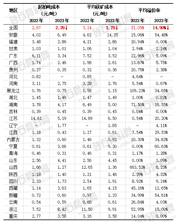 如下表所示,2023年上半年全國新成交采礦權(quán)起拍噸成本及平均獲礦成本均較2022年同期有所下降。其中,2022年僅江蘇、山西及浙江三省平均獲礦成本在10元/噸以上;2023年僅安徽省平均獲礦成本超10元/噸。(注:省噸獲礦成本=本省總成交價格/本省總儲量)??偟膩碚f,砂石噸獲礦成本與礦權(quán)所在地市的砂石消費水平和地理位置,呈現(xiàn)出沿江、沿海且砂石需求大的地區(qū)礦權(quán)價格相對較高,中西部地區(qū)價格相對較低的特征。