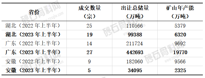 湖北、安徽及廣東等長江、珠江流域的砂石市場一直以來備受關(guān)注,為此特選取上述三個省份近兩年上半年的采礦權(quán)信息進(jìn)行簡要分析。