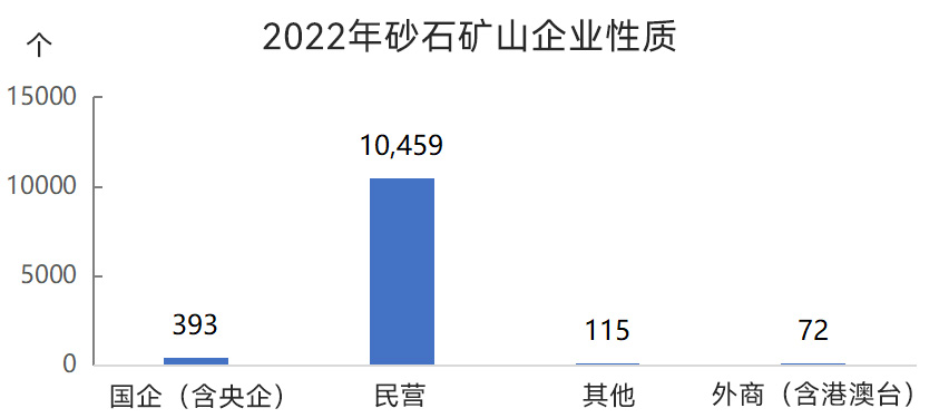 從砂石礦山企業(yè)性質(zhì)來看,國(guó)有企業(yè)(含央企)393個(gè),民營(yíng)企業(yè)較多為10459個(gè),其他類型企業(yè)115個(gè),外商(含港澳臺(tái))企業(yè)72個(gè)。