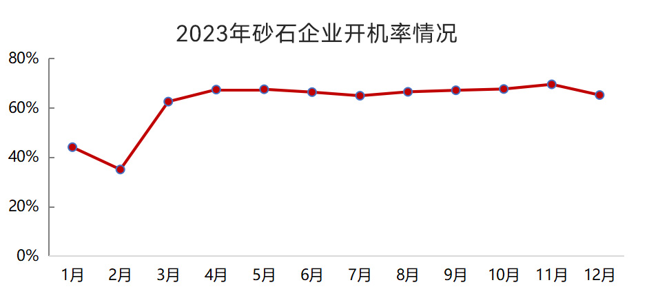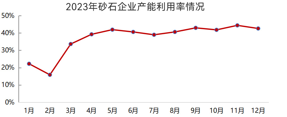 2023年,我國(guó)砂石企業(yè)產(chǎn)能利用率和開機(jī)率除了年初低位運(yùn)行以外,其他月份均保持較高水平。1月、2月,我國(guó)砂石企業(yè)產(chǎn)能利用率和開機(jī)率均值分別為19%、40%,3月~12月,產(chǎn)能利用率和開機(jī)率均值分別為41%、66%。