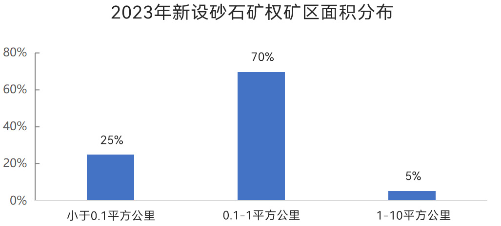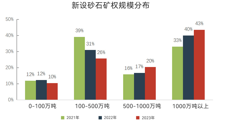 新設(shè)砂石礦權(quán)中,資源儲(chǔ)量大于1000萬(wàn)噸的超大型砂石礦權(quán)、資源儲(chǔ)量在500萬(wàn)~1000萬(wàn)噸之間的大型砂石礦權(quán),占比分別提升至43%、20%,占比均較2022年有所提升。另外,資源儲(chǔ)量在100萬(wàn)~500萬(wàn)噸之間的中型砂石礦權(quán)占比為26%;資源儲(chǔ)量在100萬(wàn)噸以下的小型砂石礦權(quán)占比為10%,中型、小型砂石礦權(quán)占比均較2022年有所下降。