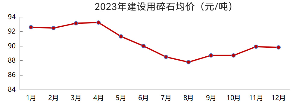 2023年12月,建設(shè)用碎石均價(jià)90元/噸,較年初下降3%。