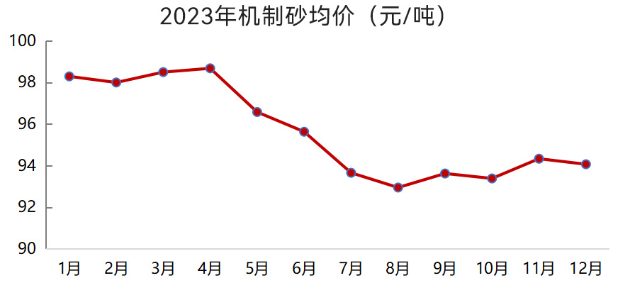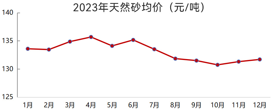 2023年12月,我國(guó)機(jī)制砂均價(jià)94元/噸,較年初下降4.3%;天然砂均價(jià)132元/噸,較年初下降1.4%。