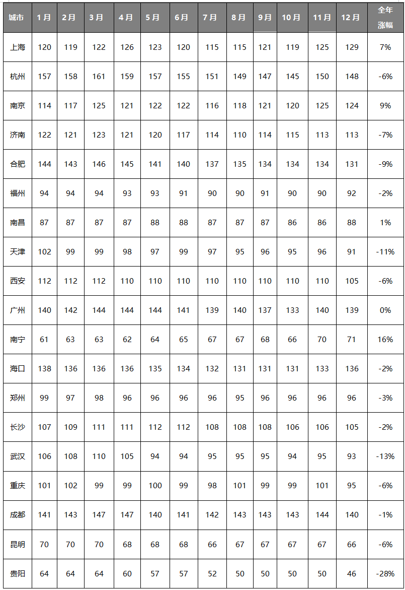 2023年中國(guó)重點(diǎn)城市砂石行情月度變化表(元/噸)