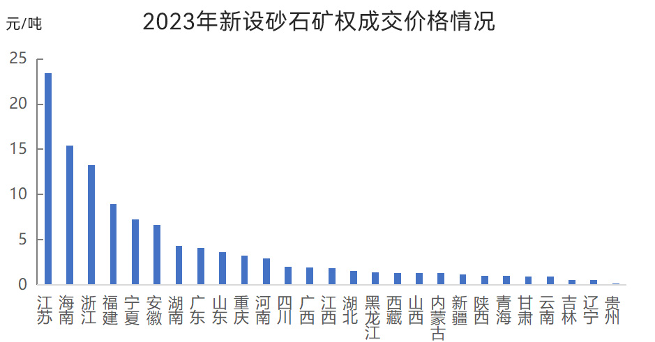 新增砂石礦權(quán)出讓成交價(jià)方面:江蘇新設(shè)砂石采礦權(quán)出讓成交均價(jià)為23.5元/噸,價(jià)格居全國(guó)首位,而甘肅、云南、吉林、遼寧、貴州新設(shè)砂石采礦權(quán)出讓成交均價(jià)在1元/噸以內(nèi)。