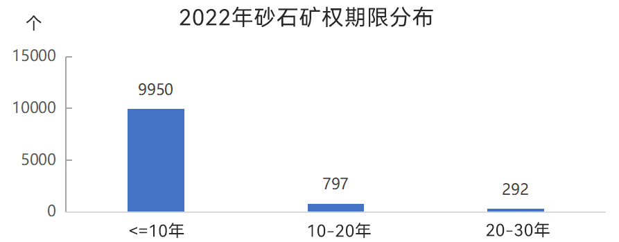 從礦權(quán)期限來看,有效期在10年以內(nèi)的砂石礦權(quán)數(shù)量較多,為9950個(gè),10~20年之間的砂石礦權(quán)797個(gè),20~30年之間的砂石礦權(quán)292個(gè)。