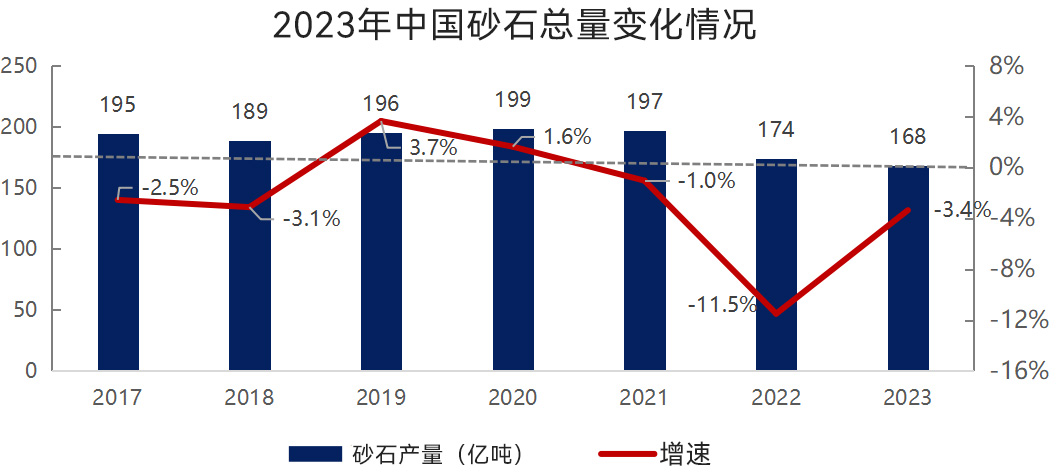 2023年國(guó)民經(jīng)濟(jì)回升向好,高質(zhì)量發(fā)展扎實(shí)推進(jìn),但外部環(huán)境復(fù)雜性、嚴(yán)峻性、不確定性上升,經(jīng)濟(jì)發(fā)展仍面臨一些困難和挑戰(zhàn)。這樣的錯(cuò)綜復(fù)雜環(huán)境之下,2023年砂石產(chǎn)量、價(jià)格持續(xù)下滑,但是降幅較2022年有所縮小,人均砂石產(chǎn)量12.4噸/人,較2022年下降3.3%。部分砂石企業(yè)凈利潤(rùn)出現(xiàn)不同程度下滑,甚至虧損。我國(guó)砂石工業(yè)已從增量擴(kuò)張進(jìn)入存量提質(zhì)增效和增量結(jié)構(gòu)調(diào)整并重的發(fā)展新階段。供需方面:2023年,全國(guó)砂石產(chǎn)量168.35億噸,較去年下降3.35%。供給端:隨著國(guó)家多部門政策文件陸續(xù)發(fā)布,近年來國(guó)內(nèi)投資砂石骨料項(xiàng)目熱情高漲。不少大型央企、國(guó)企和地方平臺(tái)公司陸續(xù)布局砂石骨料業(yè)務(wù),有力推動(dòng)砂石工業(yè)規(guī)?;G色發(fā)展,特別是沿江沿海區(qū)域砂石產(chǎn)能陸續(xù)釋放,全國(guó)砂石產(chǎn)能過剩風(fēng)險(xiǎn)已初步顯現(xiàn)。市場(chǎng)處于供大于求的狀態(tài);需求端:房地產(chǎn)投資還在探底,基建投資持續(xù)發(fā)力,但基建對(duì)砂石市場(chǎng)的拉動(dòng)作用有限,整體來看砂石有效需求明顯不足。
