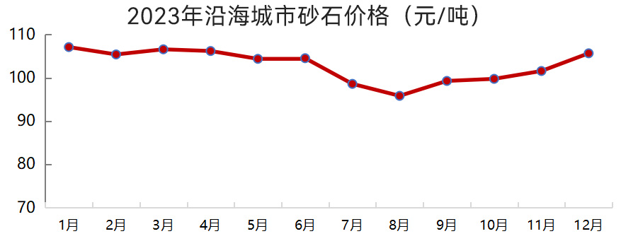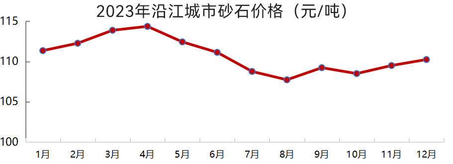 沿江、沿海城市砂石價(jià)格也整體呈下滑趨勢(shì),其中二季度需求偏弱,砂石價(jià)格下滑較為明顯。12月,沿江、沿海城市砂石均價(jià)分別為110元/噸、106元/噸,較2023年年初分別下跌1.3%、1.0%。
