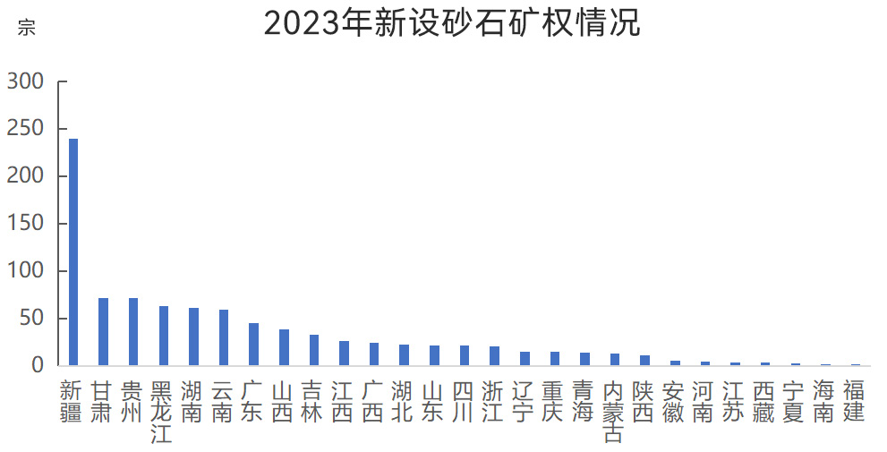 2023年,砂石企業(yè)礦權(quán)競(jìng)拍趨于理性,部分砂石礦權(quán)出現(xiàn)流拍的現(xiàn)象。全國(guó)新設(shè)砂石礦權(quán)數(shù)量915宗(已成交),其中新疆新設(shè)砂石礦權(quán)數(shù)量較多,為240宗;甘肅、貴州、黑龍江、湖南、云南新設(shè)砂石礦權(quán)數(shù)量為50~100宗;廣東、山西、吉林、江西、廣西、湖北、山東、四川、浙江新設(shè)砂石礦權(quán)數(shù)量為20~50宗;遼寧、重慶、青海、內(nèi)蒙古、陜西新設(shè)砂石礦權(quán)數(shù)量為10~20宗;安徽、河南、江蘇、西藏、寧夏、海南、福建新設(shè)砂石礦權(quán)數(shù)量均在10宗以內(nèi)。