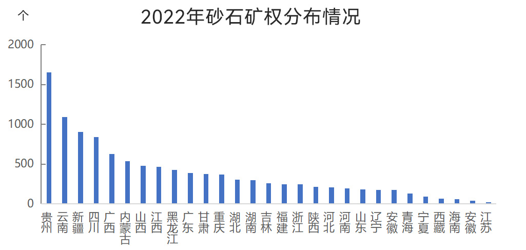截至2022年年底,我國(guó)有效期內(nèi)砂石礦權(quán)11039個(gè),從各省(自治區(qū)、直轄市)砂石礦山的分布情況來看,貴州、云南砂石礦山數(shù)量較多,分別為1653個(gè)、1089個(gè);新疆、四川、廣西、內(nèi)蒙古砂石礦山數(shù)量為500~1000個(gè);山西、江西、黑龍江、廣東、甘肅、重慶、湖北砂石礦山數(shù)量為300~500個(gè);湖南、吉林、福建、浙江、陜西、河北、河南、山東、遼寧、安徽、青海砂石礦山數(shù)量為100~300個(gè);寧夏、西藏、海南、安徽、江蘇砂石礦山數(shù)量均在100個(gè)以內(nèi);北京、天津、上海砂石礦山數(shù)量為0。