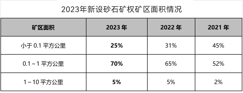 從新設(shè)砂石礦權(quán)礦區(qū)面積來看,砂石行業(yè)規(guī)?;竭M(jìn)一步提升,礦區(qū)面積小于1平方公里砂石礦權(quán)占新設(shè)砂石礦權(quán)70%,成為新設(shè)礦權(quán)的主流。新設(shè)砂石礦權(quán)中,礦區(qū)面積小于0.1平方公里的有228宗,占比為25%,占比較2022年下降6個(gè)百分點(diǎn),新設(shè)小規(guī)模砂石礦權(quán)數(shù)量持續(xù)減少;礦區(qū)面積在0.1~1平方公里之間的新設(shè)砂石礦權(quán)有637宗,占比逐年提升,2023年已經(jīng)達(dá)到70%;礦區(qū)面積在1~10平方公里之間的新設(shè)砂石礦權(quán)49宗,占比為5%。