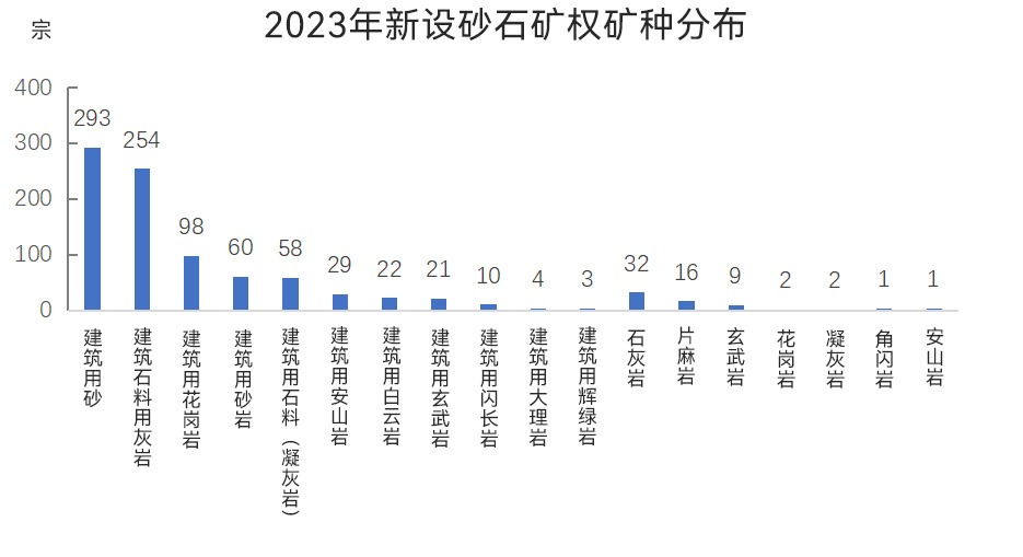 全國(guó)新設(shè)砂石礦權(quán)中,有建筑用砂、建筑石料用灰?guī)r、建筑用花崗巖、建筑用砂巖、建筑用石料(凝灰?guī)r)、建筑用安山巖、建筑用白云巖、建筑用玄武巖、建筑用閃長(zhǎng)巖、建筑用大理巖、建筑用輝綠巖、石灰?guī)r、片麻巖、玄武巖、花崗巖、凝灰?guī)r、角閃巖、安山巖18種礦種。其中建筑用砂、建筑石料用灰?guī)r兩類礦種新設(shè)礦權(quán)數(shù)量較多,分別為293宗、254宗;建筑用花崗巖、建筑用砂巖、建筑用石料(凝灰?guī)r)新設(shè)礦權(quán)數(shù)量為50~100宗;建筑用安山巖、建筑用白云巖、建筑用玄武巖、建筑用閃長(zhǎng)巖新設(shè)礦權(quán)數(shù)量為10~30宗;建筑用大理巖、建筑用輝綠巖新設(shè)礦權(quán)數(shù)量為1~5宗;另外,新設(shè)32宗石灰?guī)r礦、16宗片麻巖礦、9宗玄武巖礦、2宗花崗巖礦、2宗凝灰?guī)r礦、1宗角閃巖礦、1宗安山巖礦。