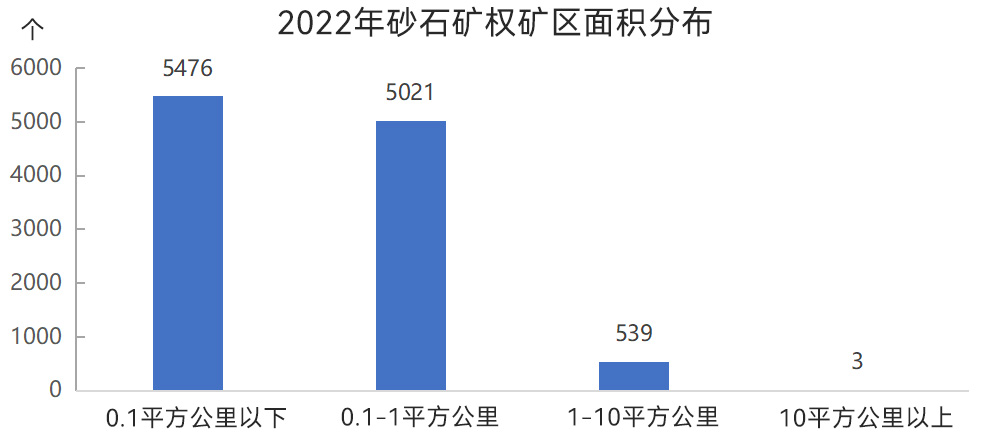 從礦區(qū)面積來看,0.1平方公里以下砂石礦權(quán)數(shù)量較多,為5476個(gè),0.1~1平方公里砂石礦權(quán)5021個(gè),1~10平方公里砂石礦權(quán)539個(gè),10平方公里以上砂石礦權(quán)3個(gè)。
