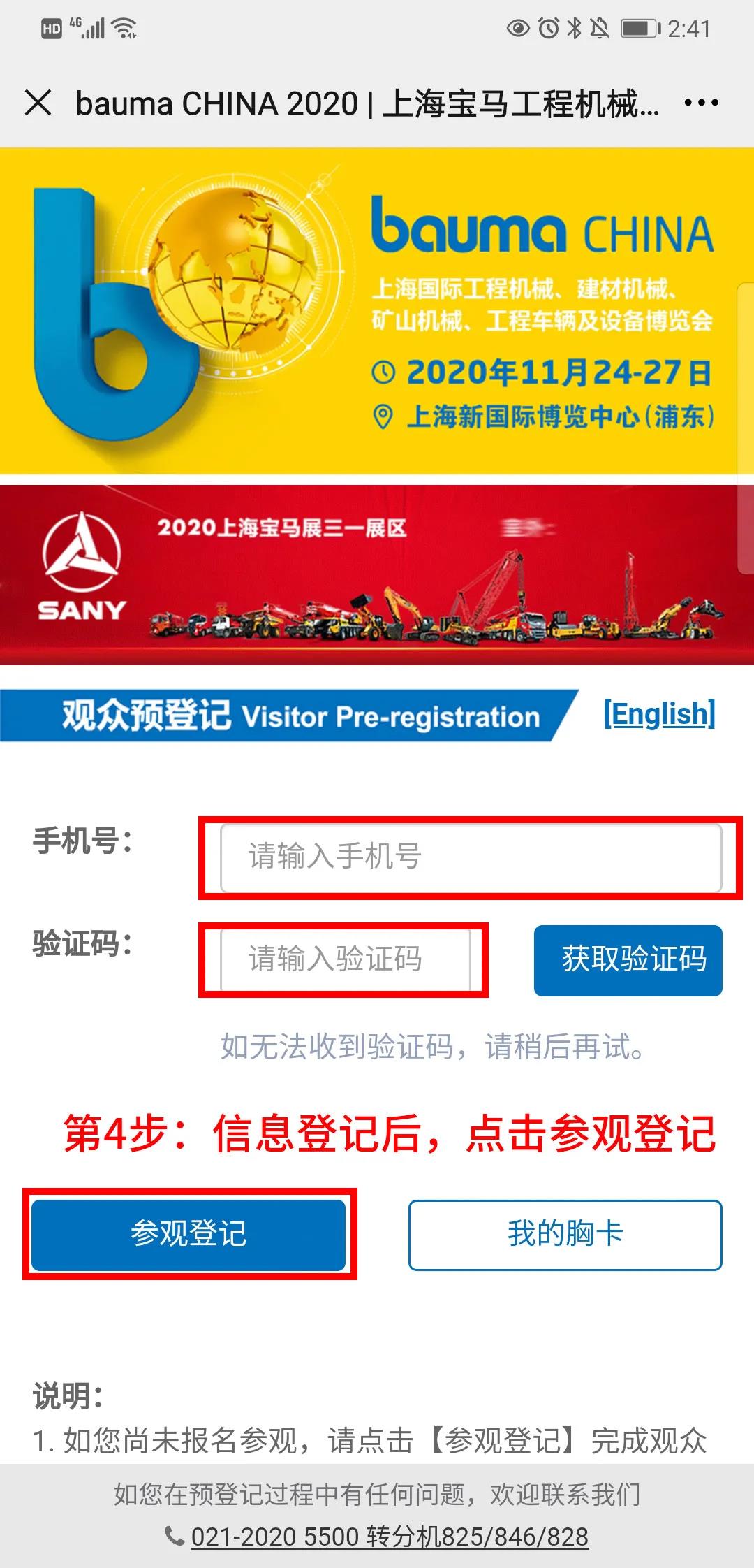 4. 填寫手機(jī)號(hào)及驗(yàn)證碼,點(diǎn)擊【參觀登記】