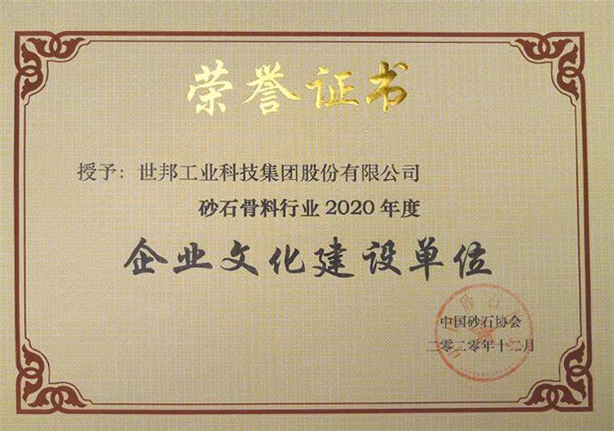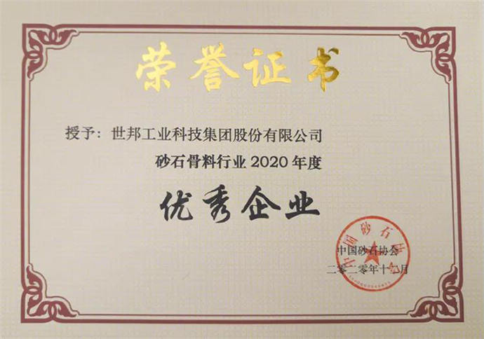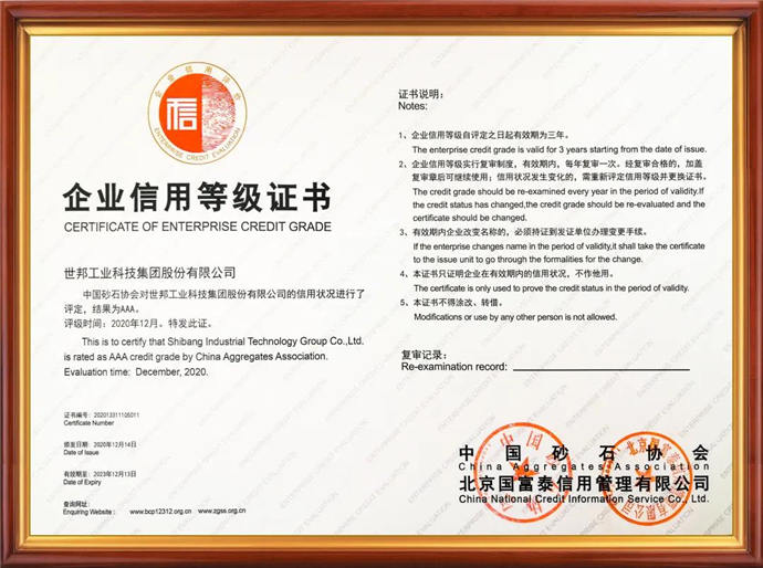 12月14日,中國砂石協(xié)會(huì)年會(huì)公布2020年度中國砂石行業(yè)企業(yè)信用等級評價(jià)結(jié)果,世邦工業(yè)科技集團(tuán)股份有限公司被評為AAA級信用企業(yè)。