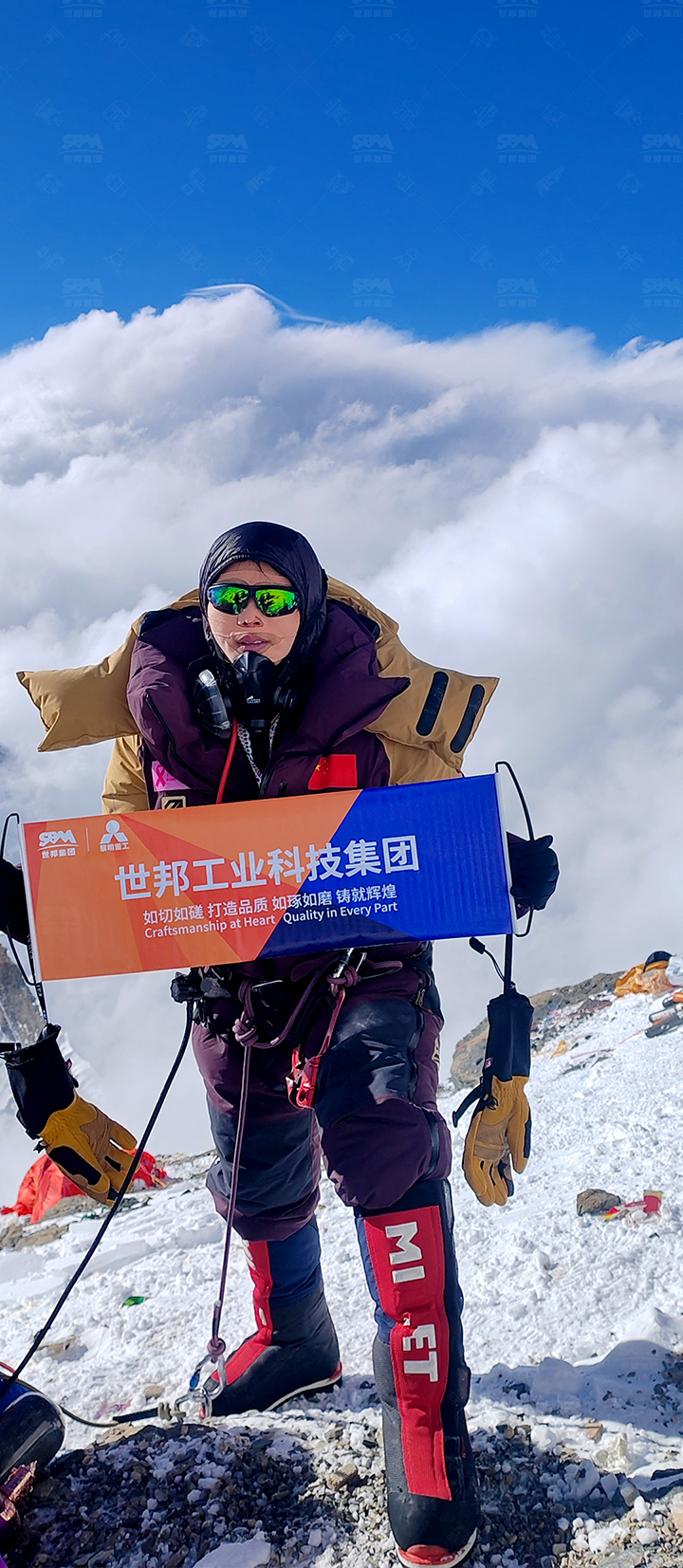 2025年5月24日,河南省首位登頂珠穆朗瑪峰的女性、當代藝術家孫寧,繼 2019 年、2023 年南坡登頂后再次成功從北坡登頂,耗時6天完成“雙側貫通”,成為河南首位實現珠峰南北雙登的登山者。第三次站上世界之巔完成了“雪山玫瑰”末了一次由北坡登頂的愿望,在海拔 8848.86 米的珠峰峰頂她舉起印有“世邦工業(yè)科技集團”字樣的旗幟,讓攀登者的無畏意志和中國企業(yè)的創(chuàng)新精神,共同在世界理想點迎風招展。