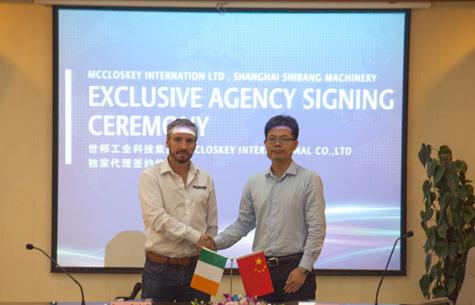 2016年9月10日,世邦工業(yè)科技集團(tuán)股份有限公司(SBM)與愛爾蘭知名履帶破碎篩分站制造商MCCLOSKEY完成獨(dú)家代理簽約儀式,Mccloskey 授權(quán)SBM 代理銷售其全系列履帶破碎篩分設(shè)備,并初步劃定中國及中國客戶在海外的投資地為合作區(qū)域。