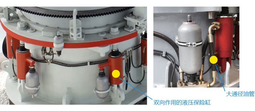 HP系列圓錐破配備了全自動液壓保險(xiǎn)系統(tǒng)且保險(xiǎn)缸油路采取大通徑油管、大容量蓄能器,緩沖性能非常好。因此,當(dāng)破碎機(jī)遇到鐵塊等非破碎物料時(shí),能夠快速做出反應(yīng),實(shí)現(xiàn)自動排除雜物的功能,保障設(shè)備安全。