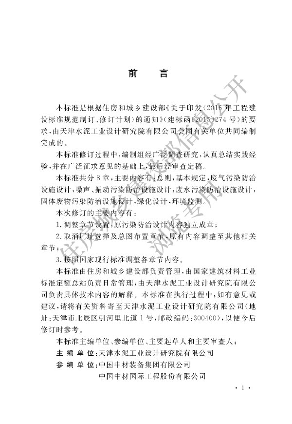 本標準是根據(jù)住房和城多建設部《關于印發(fā)<2016年工程建設標準規(guī)范制訂、修訂計劃>的通知》建標函[2015]274號)的要求,由天津水泥工業(yè)設計研究院有限公司會同有關單位共同編制完成的。