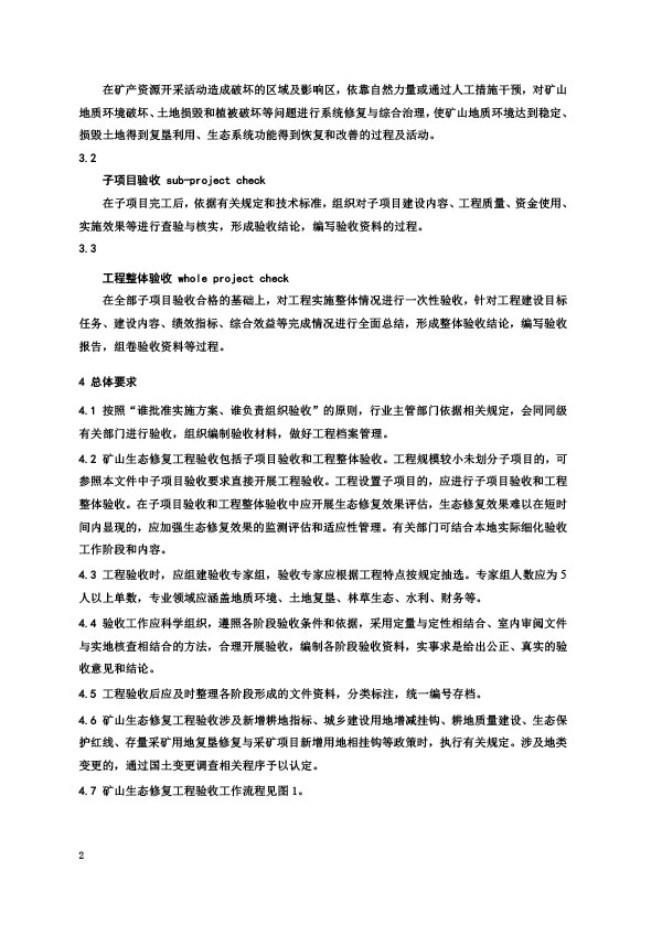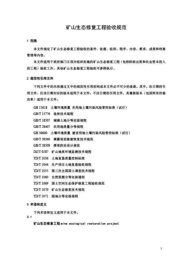 本文件規(guī)定了礦山生態(tài)修復(fù)工程驗(yàn)收的條件、依據(jù)、組織、程序、內(nèi)容、要求、成果和檔案管理等內(nèi)容。本文件適用于政府部門(mén)立項(xiàng)并組織實(shí)施的礦山生態(tài)修復(fù)工程(包括財(cái)政出資和社會(huì)資本投入的工程)驗(yàn)收工作,其他礦山生態(tài)修復(fù)工程驗(yàn)收可參照?qǐng)?zhí)行。