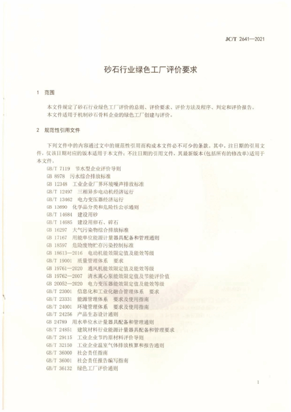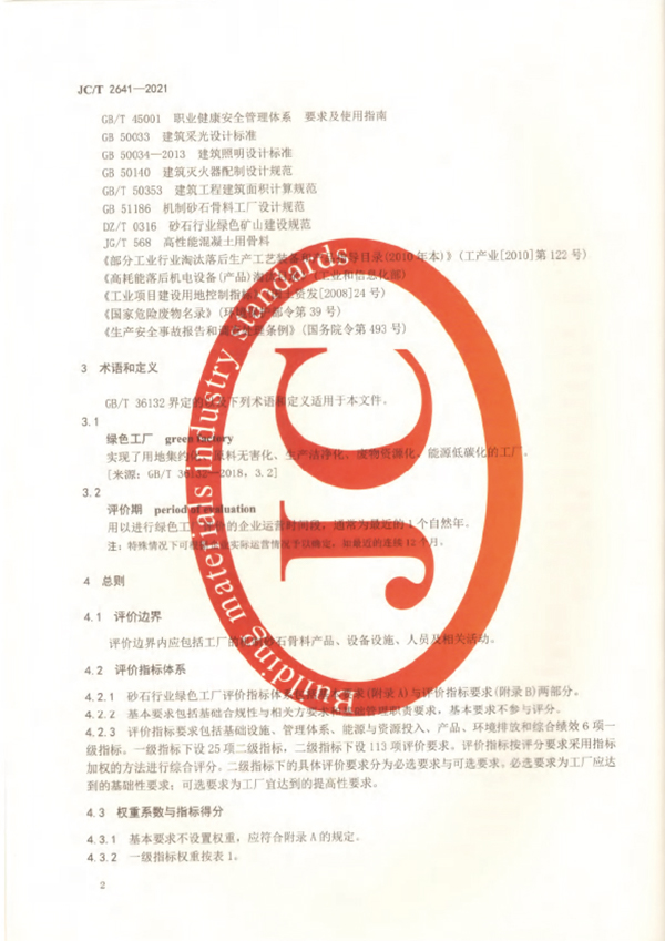 本標準根據(jù)砂石行業(yè)特點及綠色發(fā)展趨勢,以節(jié)能、減排、綠色、低碳為核心,圍繞行業(yè)先進技術、裝備、管理等方向,制定了綜合全面的砂石行業(yè)綠色工廠評價指標體系,適用于機制砂石骨料企業(yè)的綠色工廠創(chuàng)建與評價。