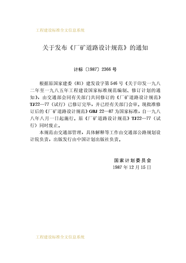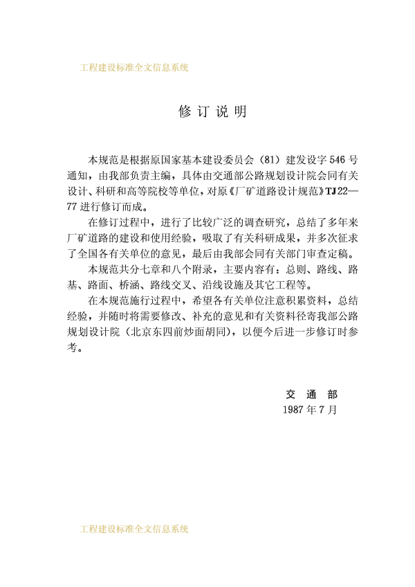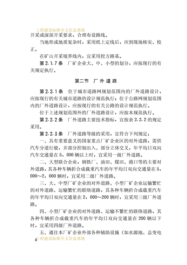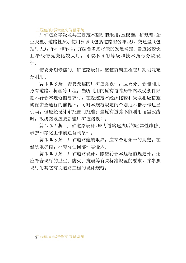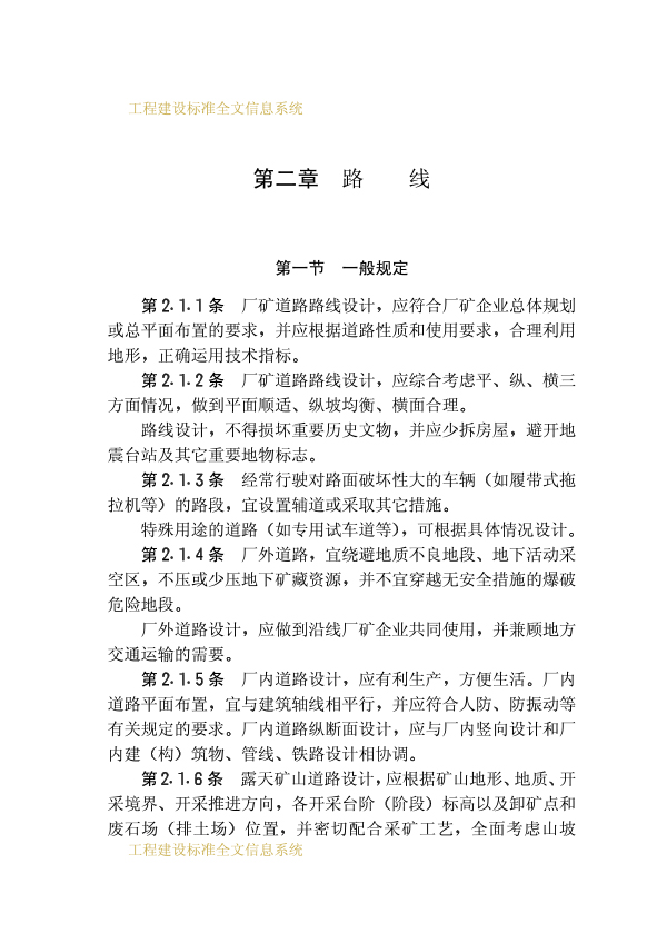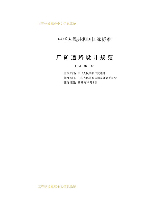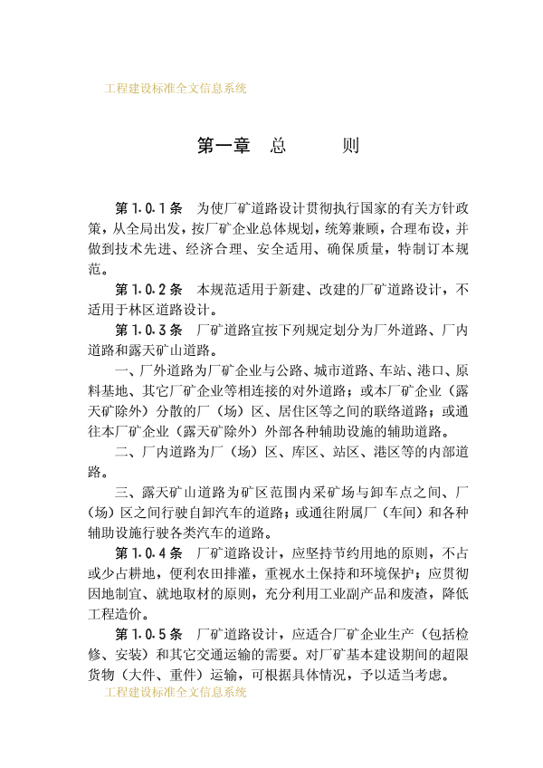 為使廠礦道路設(shè)計(jì)貫徹執(zhí)行國家的有關(guān)方針政策,從全局出發(fā),按廠礦企業(yè)總體規(guī)劃,統(tǒng)籌兼顧,合理布設(shè),并做到技術(shù)先進(jìn)、經(jīng)濟(jì)合理、安全適用、確保質(zhì)量,特制訂本規(guī)范。本規(guī)范適用于新建、改建的廠礦道路設(shè)計(jì),不適用于林區(qū)道路設(shè)計(jì)。