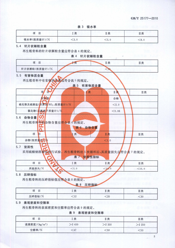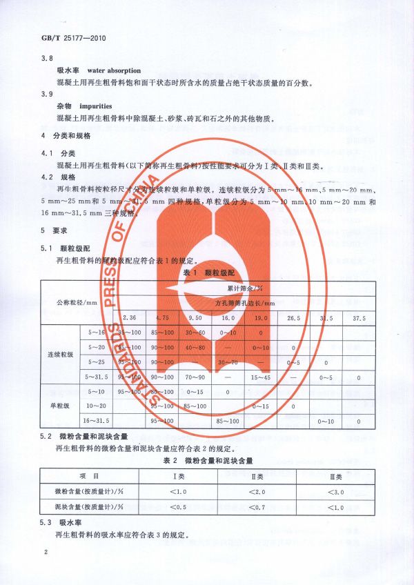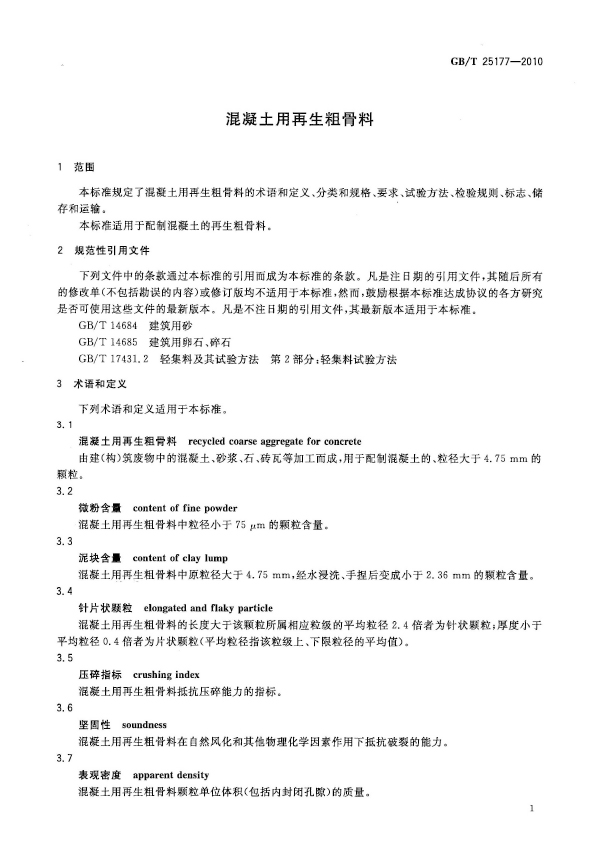 目前破碎產(chǎn)生的粗骨料質(zhì)量不穩(wěn)定,因此對骨料的性能進(jìn)行分析,為后續(xù)建筑垃圾再生粗骨料的應(yīng)用提供技術(shù)支持。本標(biāo)準(zhǔn)適用于配置混凝土用再生粗骨料,規(guī)定了再生粗骨料的術(shù)語和定義、分類和規(guī)格、要求、試驗方法、檢驗規(guī)則、標(biāo)志、儲存和運輸。