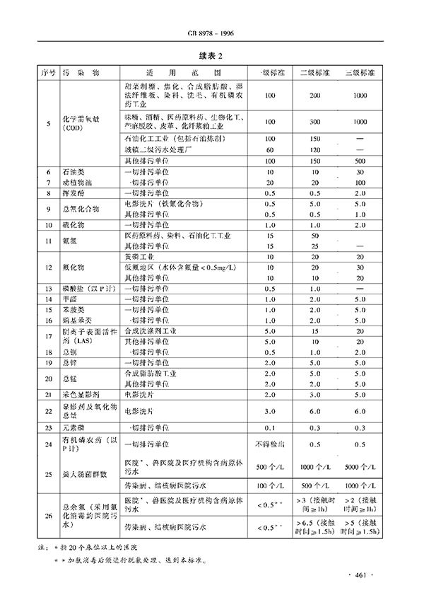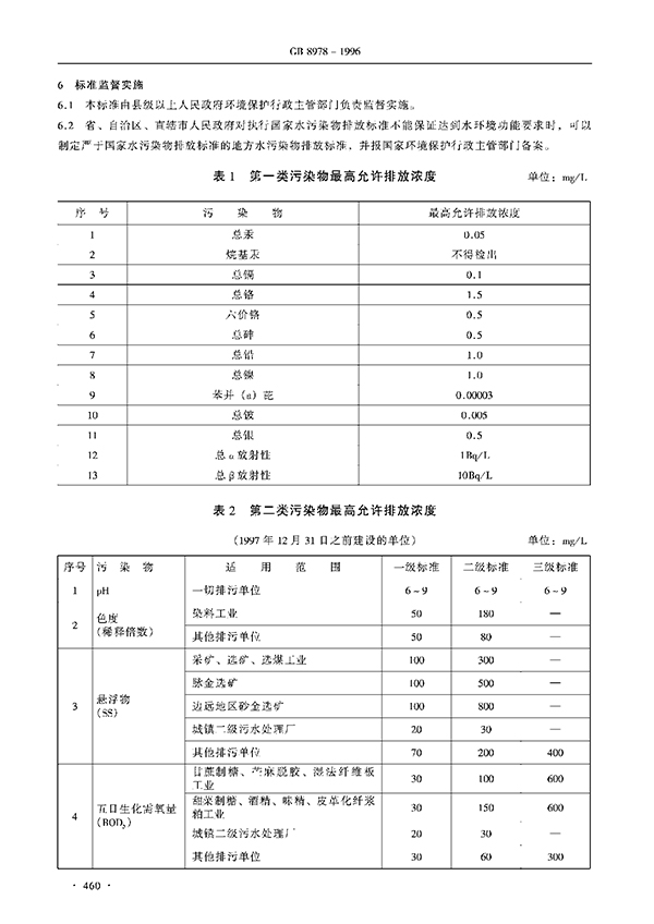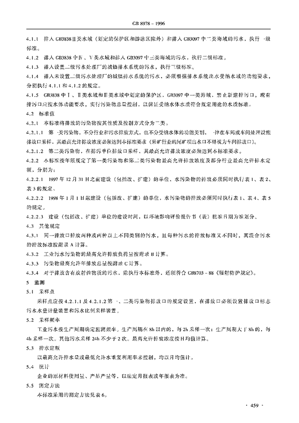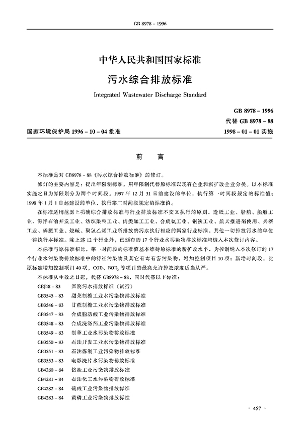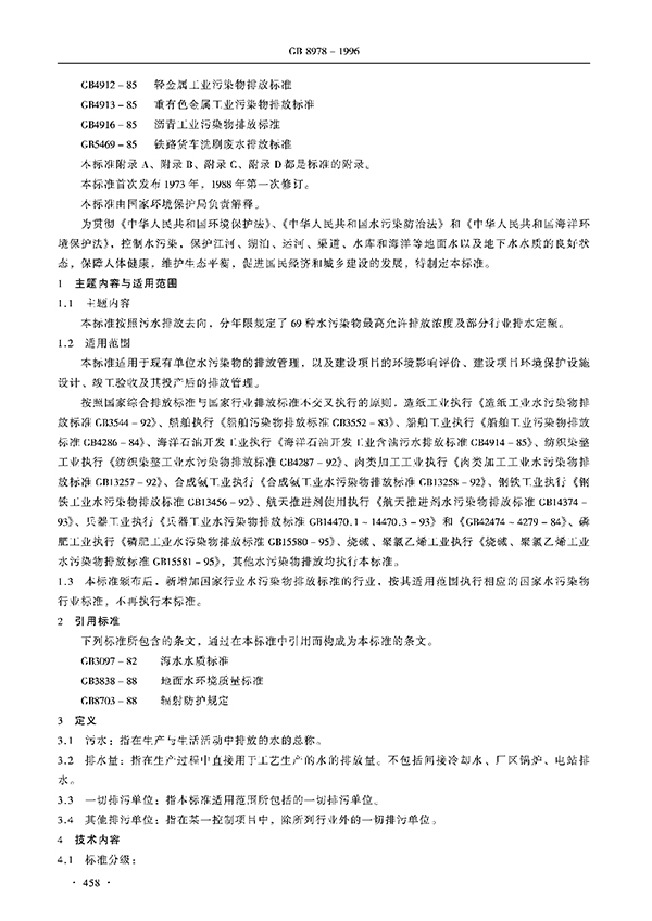 本標(biāo)準(zhǔn)按照污水排放去向,分年限規(guī)定了69種水污染物理想允許排放濃度及部分行業(yè)理想允許排水量。本標(biāo)準(zhǔn)適用于現(xiàn)有單位水污染物的排放管理,以及建設(shè)項(xiàng)目的環(huán)境影響評價、建設(shè)項(xiàng)目環(huán)境保護(hù)設(shè)施設(shè)計、竣工驗(yàn)收及其投產(chǎn)后的排放管理。