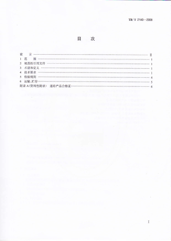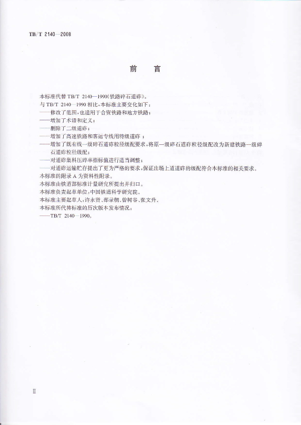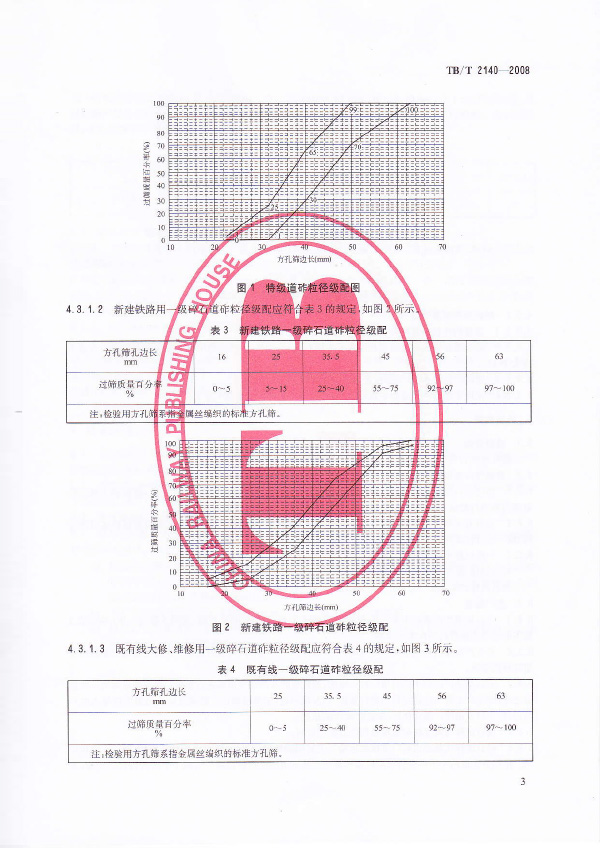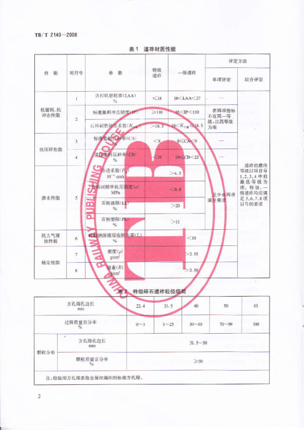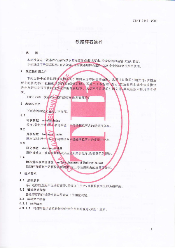 本標(biāo)準(zhǔn)規(guī)定了鐵路碎石道砟的技術(shù)要求、檢驗規(guī)則和運輸、貯存、驗交。明確對道砟粒徑、級配、顆粒形狀及清潔度的檢驗指標(biāo);對道砟集料壓碎率指標(biāo)值做出規(guī)范;對道砟運輸貯存提出了更為嚴(yán)格的要求,保證出場上道道砟的級配符合本標(biāo)準(zhǔn)的相關(guān)要求。
